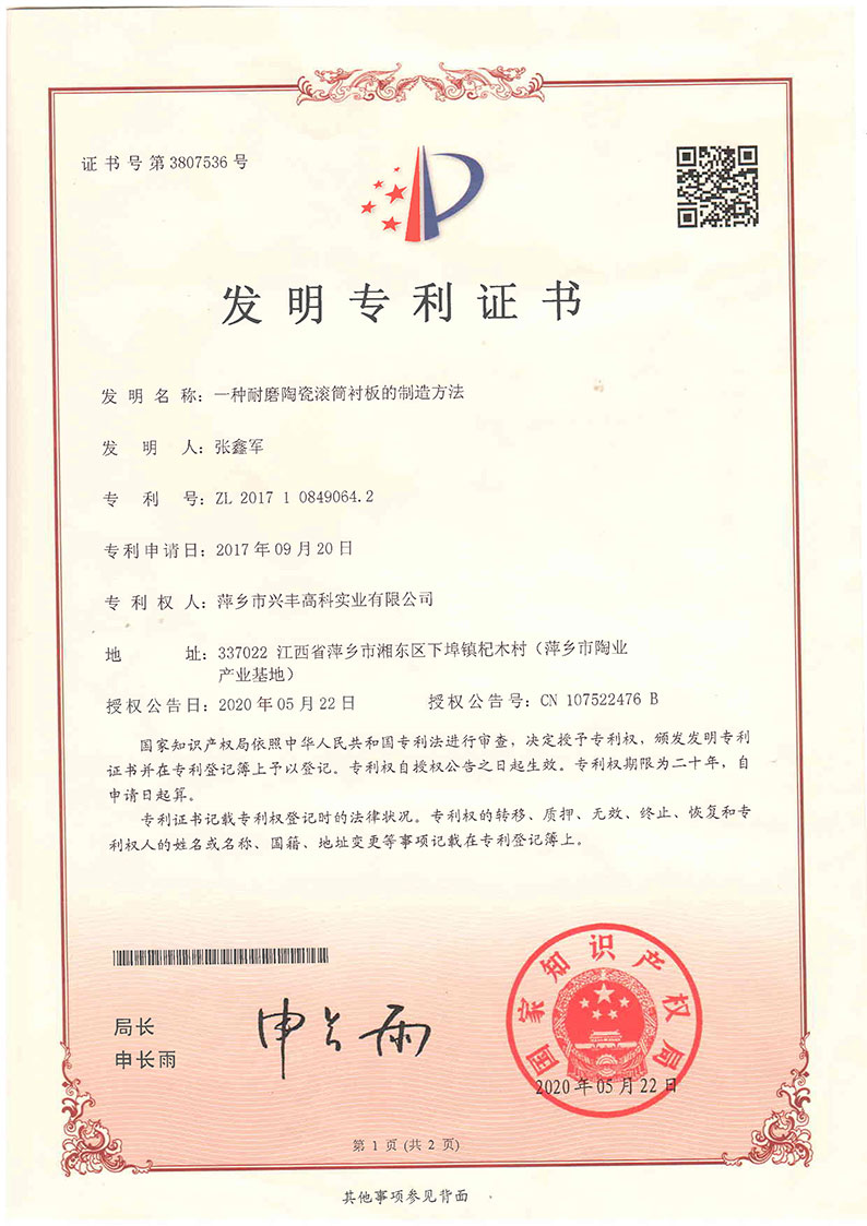 陶瓷襯板專利證書
